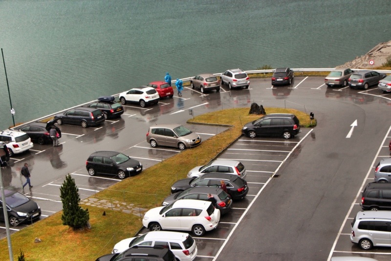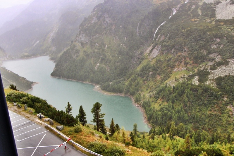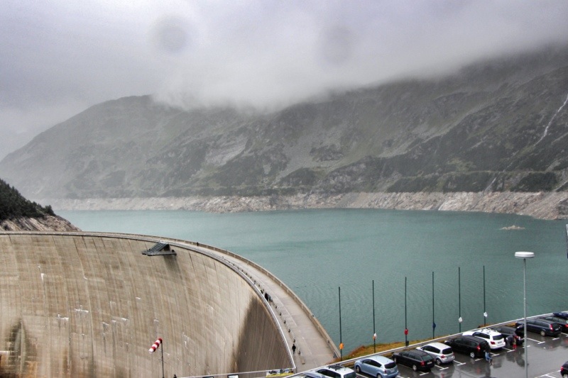 Az út a hatalmas Kölnbreini-gátnál ér véget (1933 m), amely a legmagasabb víztározó fal Közép-Európában. Sajnos, már felfelé elkezdett zuhogni az eső, mire felértünk a gáthoz, a zuhihoz még orkán erejű szél is társult, hát nem épp kiránduló idő fogadott minket 😦 Kár, mert a gát karimáján végig lehet sétálni, ahonnan lélegzet állító látvány nyílik a tározóra és a völgyre is… No, ezt ma kihagytuk… De, majd talán máskor…