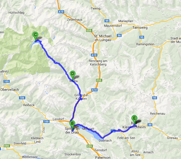 Spittalban némi vásárlás (jó kis angebótos cipő és táska befigyelt), majd irány Malta, pontosabban a Malta Hochalmstrasse. Ez egy nagyon szép alpesi autóút, a teljes hossza kb. 15 km, 9 híd, 7 alagút vezet át rajta, a szintkülönbség 1085 m. Útközben gyönyörű kilátás nyílik a Hohe Tauern hegyi világára, a táj szépségét több helyen is vízesések, vizmosások látványa emeli. Ebből én mint vezető sok mindent csak a szemem sarkából láttam, annál sokkal kanyargósabb volt az út, semmint nagyon nézelődni tudtam volna… 🙂 Vannak részek, ahol lámpa irányítja a forgalmat, a túl szűk kanyarok, ill. alagutak miatt csak egy irány fér el. Az alagutakat nem igen kedvelem, ezek ráadásul szűkek, nem is olyan jól megvilagítottak és némelyik még kanyargós is, szóval szép kihívás 🙂 Kiscsucsu is szuperül vette a megpróbáltatásokat, esküszöm, néha sajnáltam az emelkedőn erőlködve… Tudom, ez olyan csajszis baromság, de én felvállalom :)))