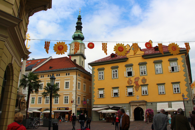 Csak délutánra jósoltak esőt, jónak ígérkezett egy kis klagenfurti séta… Moha bával a belváros felé irányítottuk magunkat, az első feladat a parkoló keresés volt. Persze, az utcán egy deka szabad hely nem volt, így akkor irány valami parkoló. Klassz dolog, amikor a GPS irányít, közben a kis utcákban kanyarogsz ide-oda, és még ezt turbózzák az utca közepén (!) tekergö bicajosok 🙂 Komolyan, otthon legalább az út szélére húzódnak, itt simán elfoglalják a sávot, és halál kényelmesen haladnak… 😦