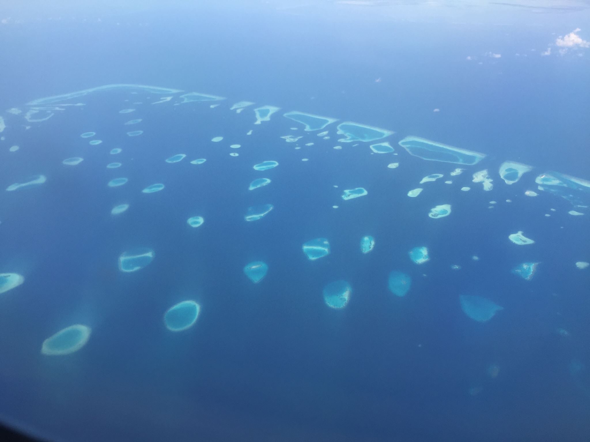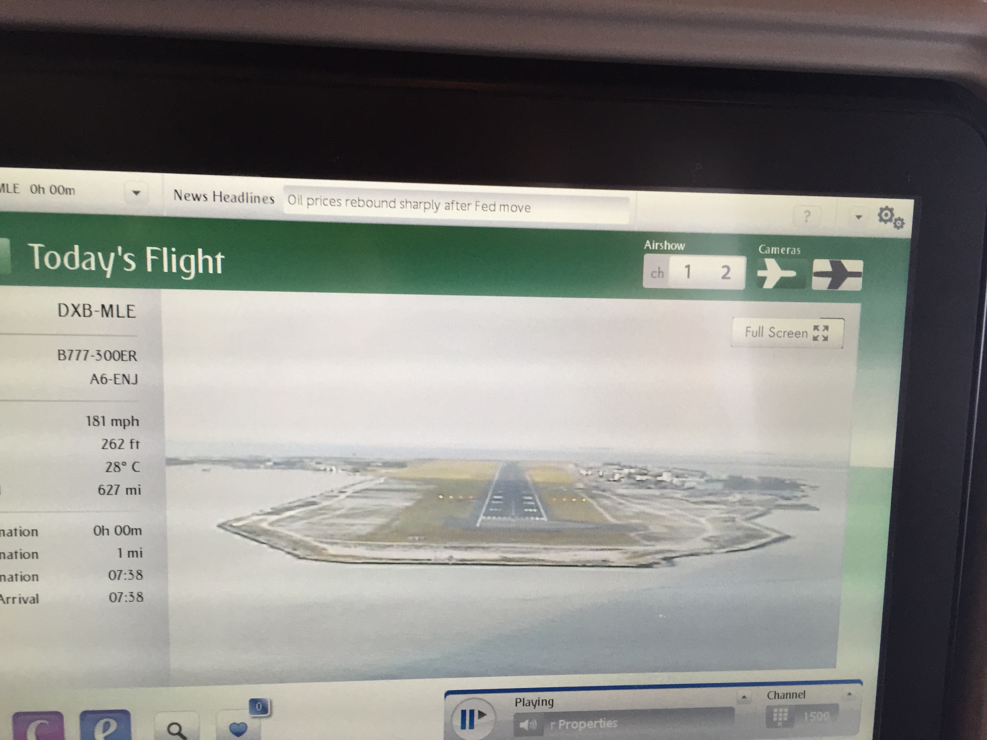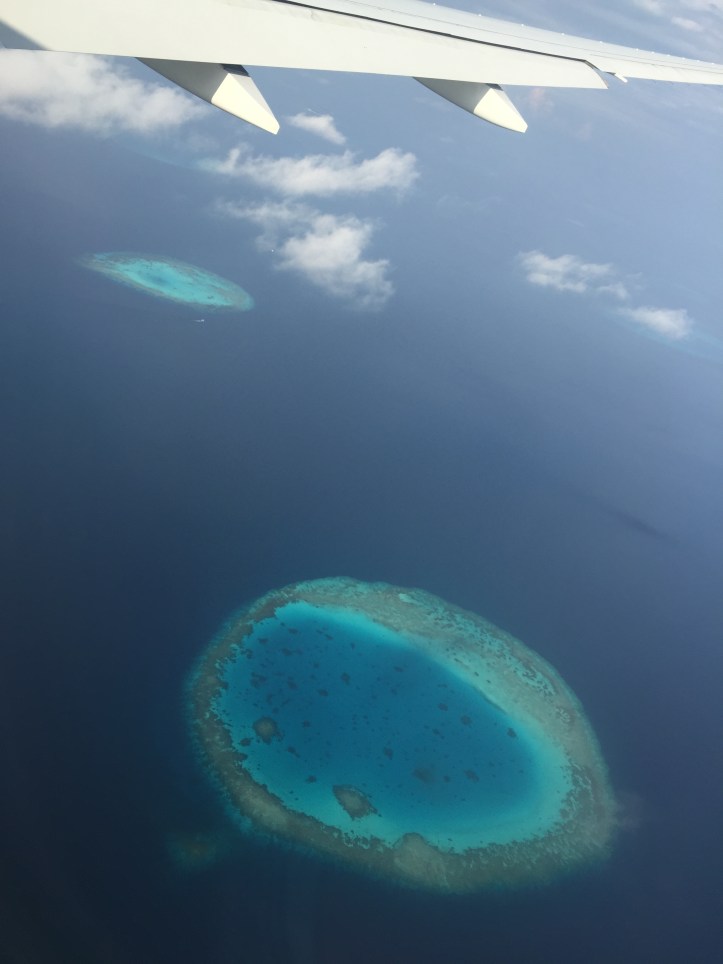 Úgy alakult, hogy Dubai-ig együtt mentünk, onnan viszont már külön, így én érkeztem elsőként Malébe. Szerencsém volt, mert a Dubai-Malé járat elég üres volt, így kényelmesen, 3 ülésen elfeküdve töltöttem az utat 🙂 Reggel már próbáltam nem aludni a gépen, hogy láthassam a Maldív első kis szigeteit. Csodás volt a felkelő nap fényeiben meglátni az Indiai-óceánt, majd kicsivel később a Maldív első gyöngyszemeit. 🙂