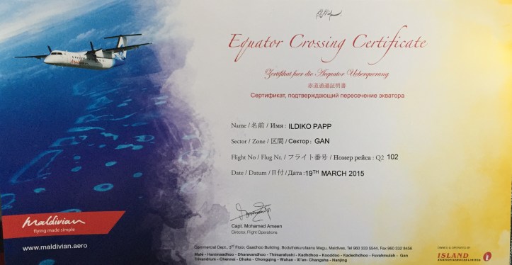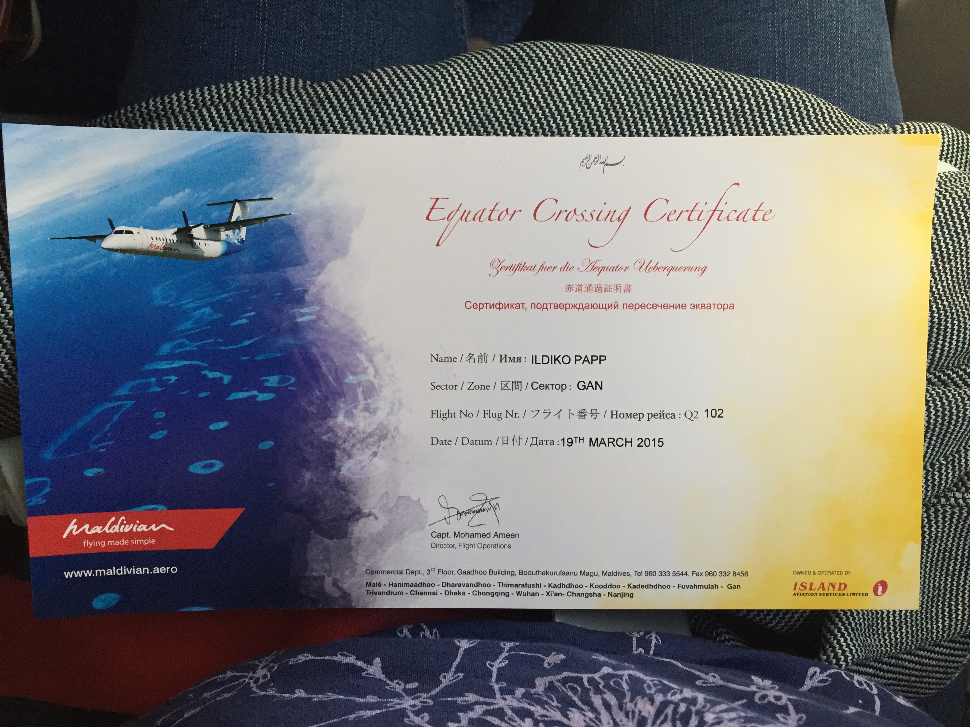 A belföldi járatnál nem sokat szórakoztak velünk, hipp-hopp a kb 40 fő szállítására alkalmas gépen találtuk magunkat. Az úti célunk a Maldív-szigetek legdélebbi atollja, az Addu-atoll (régebbi nevén Seenu atoll) volt, ami már egy picivel az Egyenlítő alatt helyezkedik el. Mókás volt, amikor elértük az Egyenlítőt, egy kis szignált hallottunk, majd a sztyuvi kislány oklevelet adott át minden utasnak, gratulálva az Egyenlítőn való áthaladáshoz 🙂
