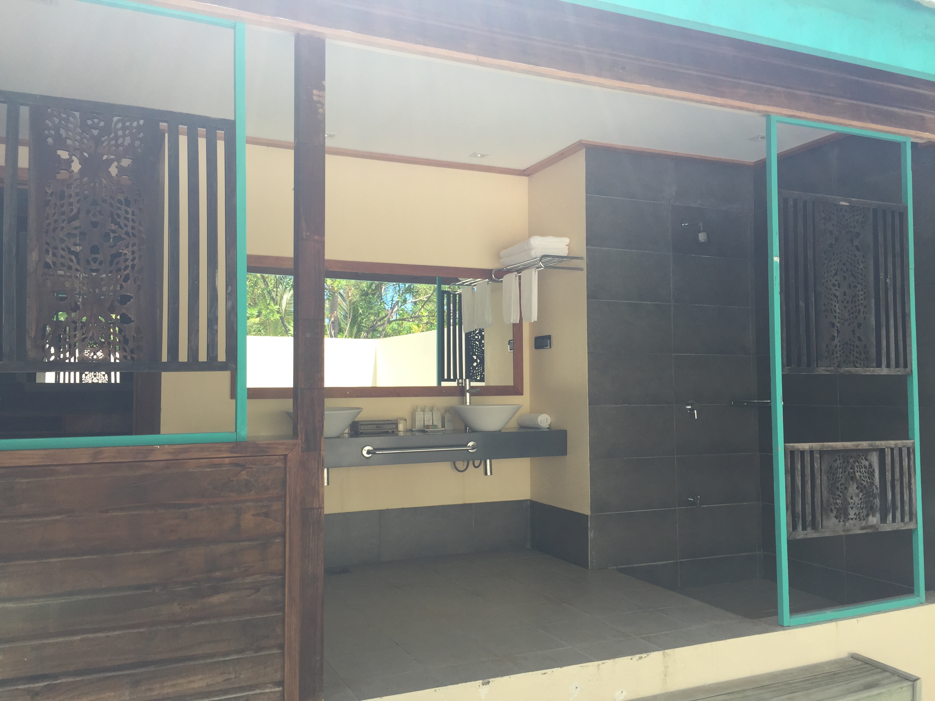 A bungik egymás mellett sorakoznak a parton, de a közöttük burjánzó növényzet kellő magán szférát biztosít, és mindenkinek saját kis tengerparti része van. A bungik egyszerűen berendezettek, a Maldív szigeteki szállodáktól megszokott luxus itt nem jellemző. Az ár mellett ezért is tetszett meg ez a hotel 🙂 Kicsit kopott minden, a hotel az elmúlt időben több tulajdonos váltáson is ment át, látszik, hogy most kezdik rendbe hozni a sokáig elhanyagolt részeket. Bulis a félig nyitott fürdőszoba, a teraszról elénk táruló látvány pedig fantasztikus. 🙂