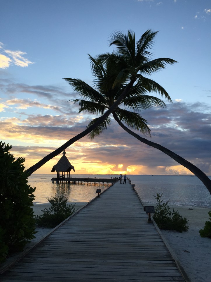 A hotel “bejáratánál” megláttuk a képekről már ismerős 2 ívesen egymást keresztező pálmát, ekkor kezdett tudatolsulni bennünk, hogy megérkeztünk a paradicsomba 🙂 A hotelnek helyet adó sziget hosszú, de keskeny, igy viszonylag nagy távolságok vannak. Kis elektromos golf autó szerűség a szállító eszköz, ezzel robogtunk a bungijaink felé. A foglalásnál lehetett választani, hogy naplementés vagy napfelkeltés bungit szereténk, az első az atoll nagy lagúnájára néz, a másik az óceánra. Mi a csendes lagúnája nézőt választottuk, ami utólag jó választásnak is tűnt, mert a túloldalon az általunk csak “gyorsvonatnak” elnevezett hullám robaj néha tényleg brutálisan hangos, emellett a hullámok miatt fürdésre nem is alkalmas.