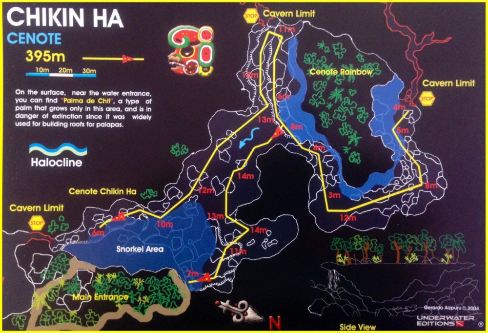 A Chikin Ha nem egy bonyolult cenote, szerintem még én is visszataláltam volna a bejárathoz. Mivel itt nem nagyok a távolságok, jól bebarangoltuk az egészet. A tágas barlangok, a hatalmas sziklák a beszűrűdő fényben elég utópisztikus látványt nyújtanak. Itt nincs sok cseppkő képződmény, néha nem is értettem, hogyan került 1-1 darab ide-oda. A cenote-k elővilága elég gyér, itt is csak néhány kis harcsa és valamilyen vak minihal jött szembe velünk. A sok nyitott rész miatt a beszűrődő fény nagyszerű látványt nyújt. A másik cenote-be (Cenote rainbow) átúszva olyan érzésem volt néha, mintha jég alatt úsznánk. A víz felszínen úszó békanyál szerűség és a beszűrűdő fény valami ilyen hatást keltett bennem. Emellett, szenzációsak a barlangba, sőt még a víz alá is benyúló fa gyökerek is! Felmerülve a szomszéd cenotében még denevéreket is láttunk szálldosni.