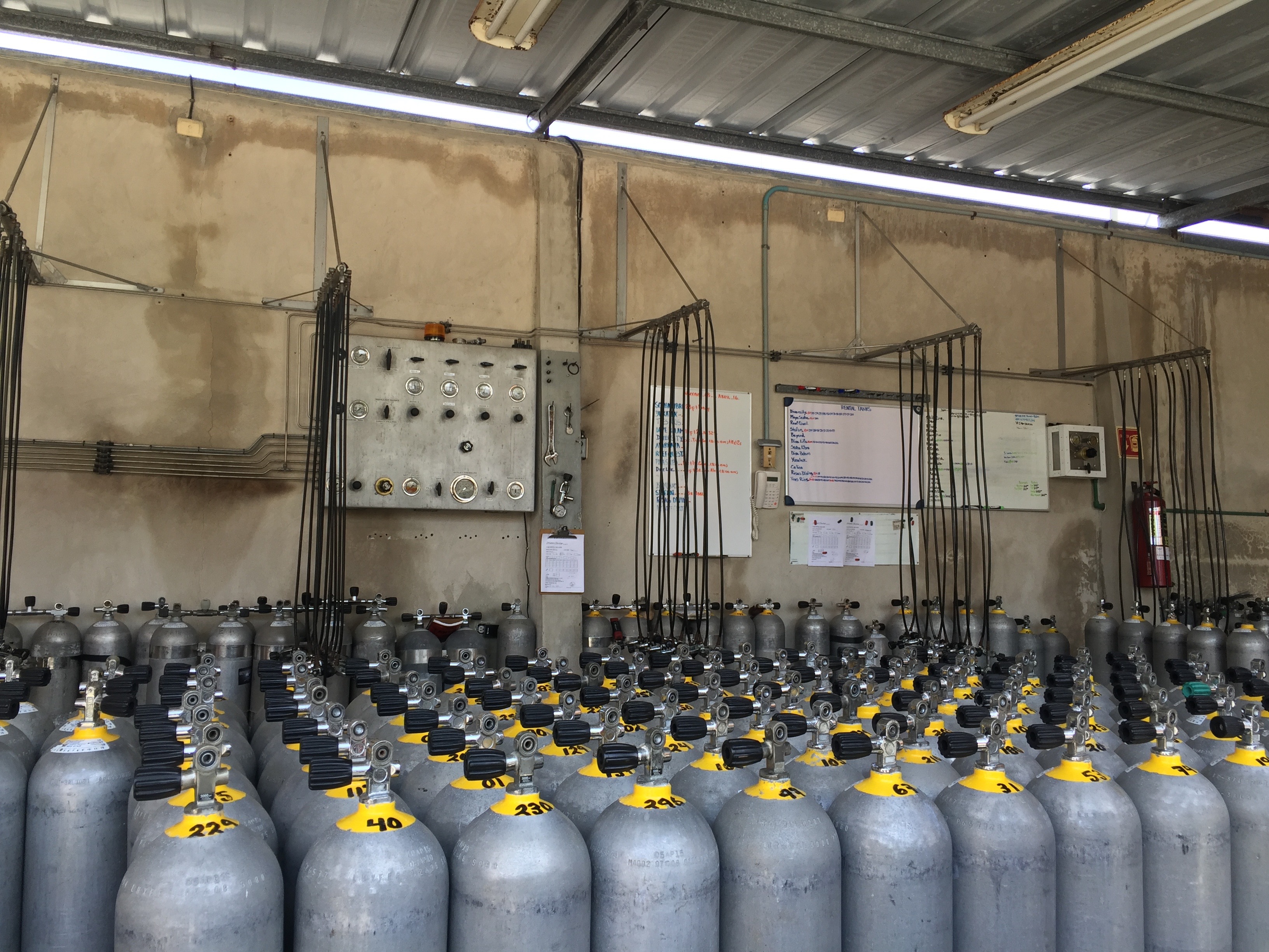 Komótosan összeszedtünk mindent, aztán elindultunk. Még kellett extra dupla palackot is szerezni (cenoteben a vezetőnek kötelező ilyet vinnie, a másik búcár miatt a saját palack már foglalt volt), szóval, meglátogattunk egy palacktöltő üzemet is. A palacktöltéshez szükséges kompresszorok – a teljesítménytől függően – elég drágák, így a dive centerek nem feltétlen vesznek, hanem bérlik a töltött palackokat. Reggelente és délután nagy platós autókat lehet a parti részen látni (és persze a palackok összekoccanásának zenéjét hallanni), ahogy hozzák-viszik az üres-töltött palackokat.